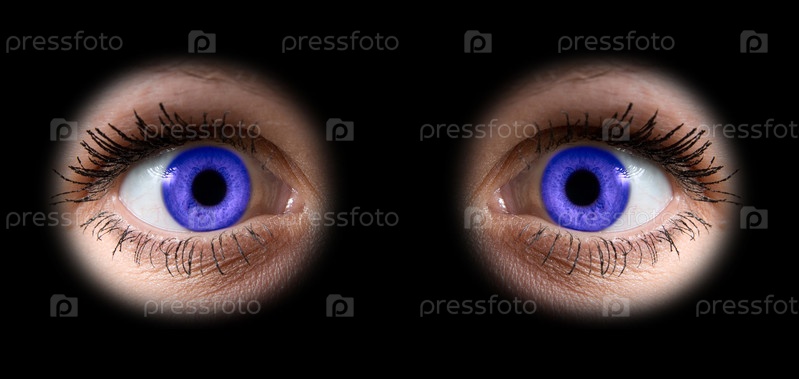 Крупным планом фиолетовые линзы в женских глазах на черном фоне