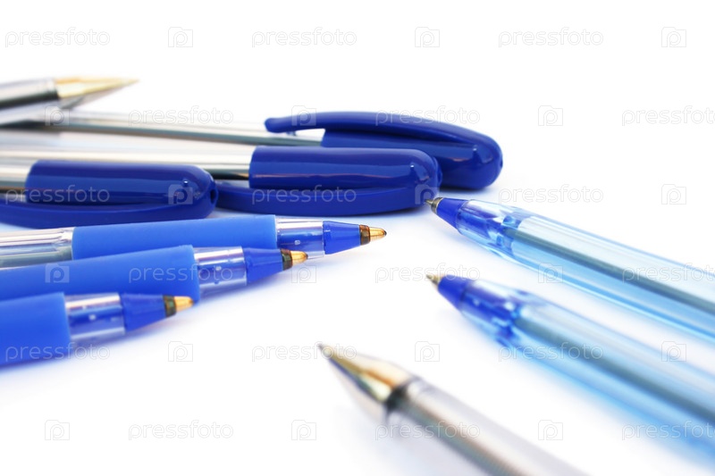 Синие авторучки на белом фоне