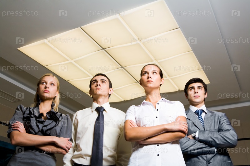 Портрет умных сотрудников, стоящих в очереди и серьезно смотрящих вверх
