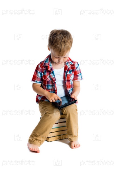 Озорной мальчик в клетчатой рубашке с планшетом