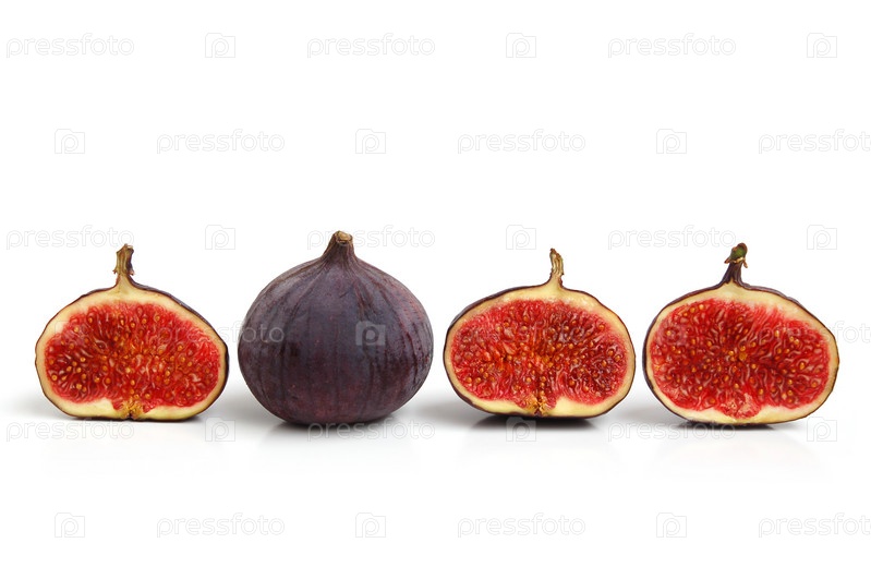 Свежеспелые инжиры и сочный кусочек на белом фоне