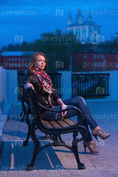 Красивая девушка сидит на скамье в городском парке сумеречным вечером