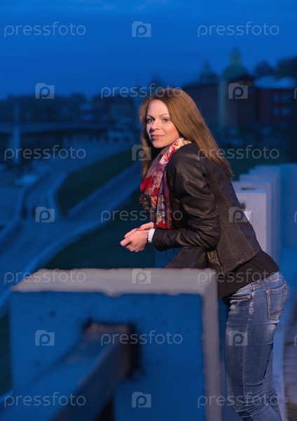 Красивая девушка стоит возле ограждения в городском парке сумеречным вечером