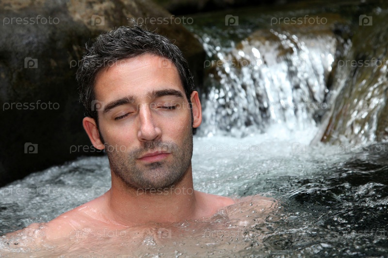 Мужчина наслаждается купанием в горном озере