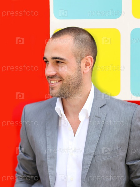 Уверенный мужчина на фоне яркой стены