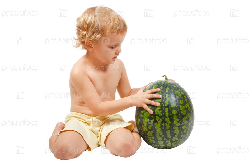 Маленький мальчик с арбузом на белом фоне