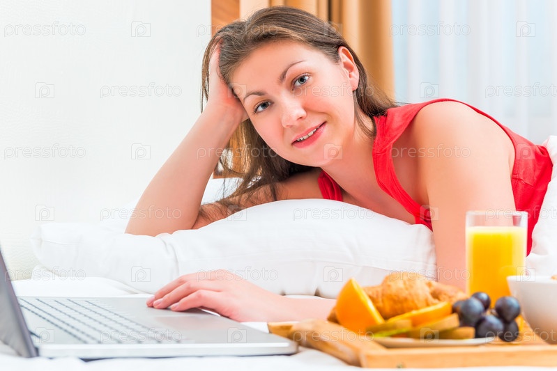Девушка европейской внешности с ноутбуком в постели