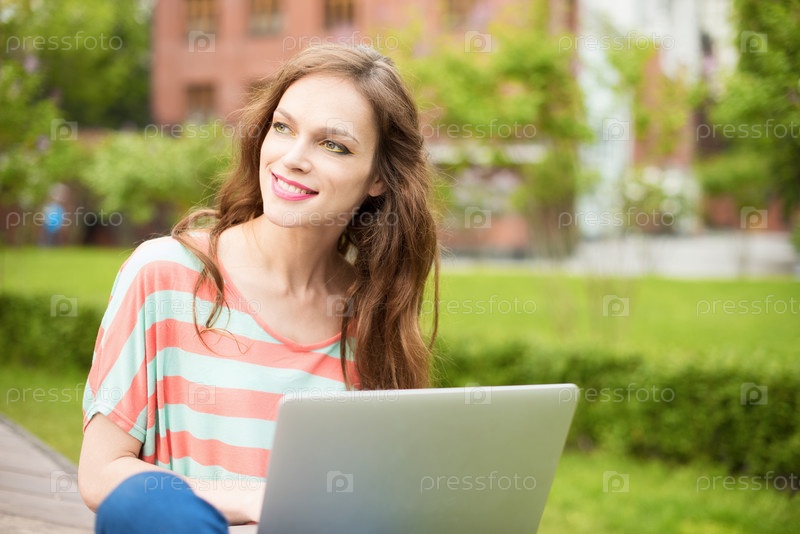 Красивая женщина, используя ноутбук на открытом воздухе