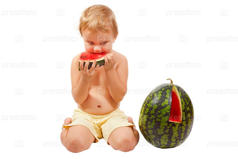 Маленький мальчик ест арбуз на белом фоне