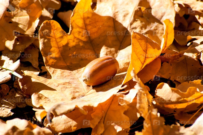 Желудь на дубовых осенних листьях