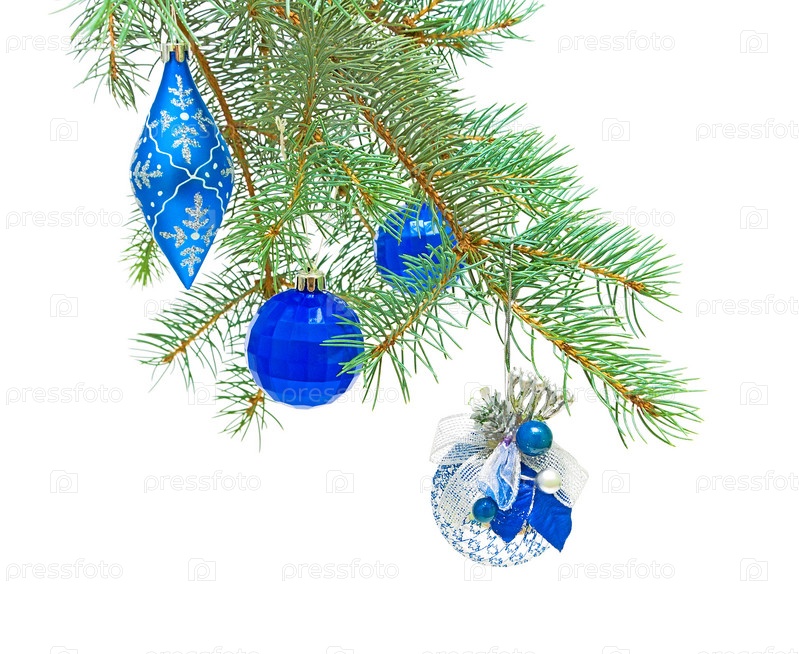 Синие новогодние украшения на еловой ветке, белый фон