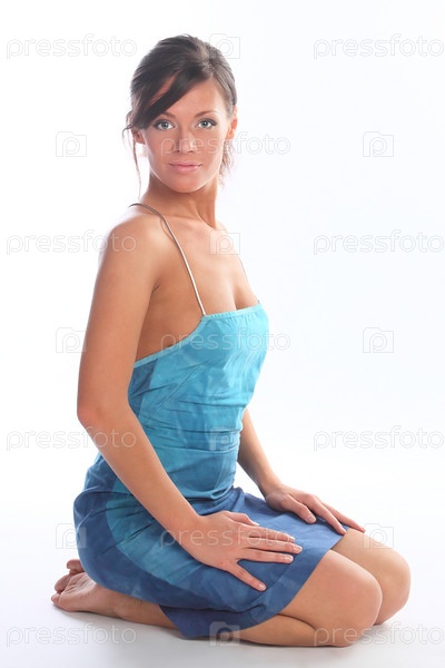 Портрет молодой девушки, сидящей на белом фоне