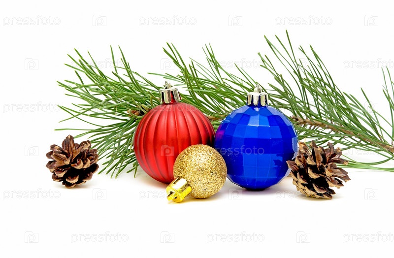 Новогодние украшения, еловая ветка и шишки на белом фоне
