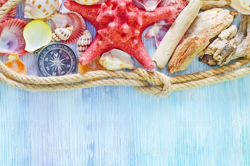 Морские ракушки на голубом фоне
