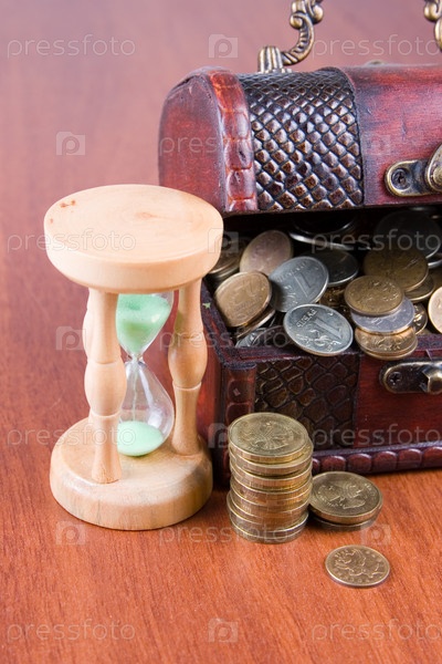 Открытый сундук с монетами и песочные часы на деревянной поверхности