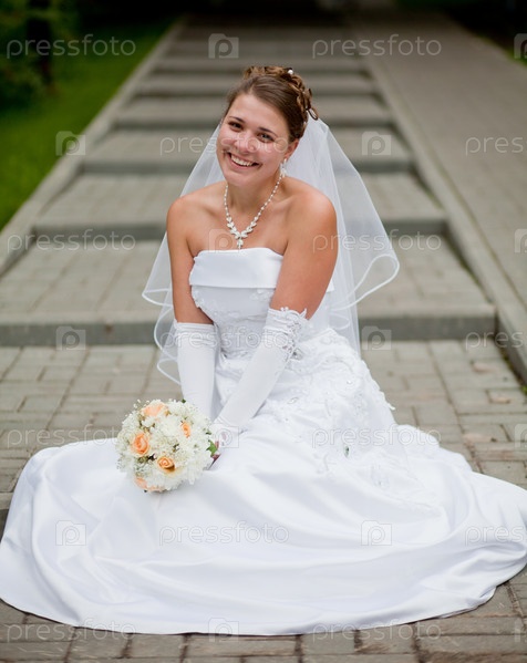Невеста сидит в парке на ступеньках