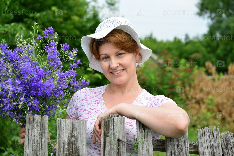 Женщина с полевыми цветами рядом деревянный забор в деревне