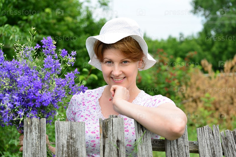 Женщина с полевыми цветами рядом деревянный забор в деревне