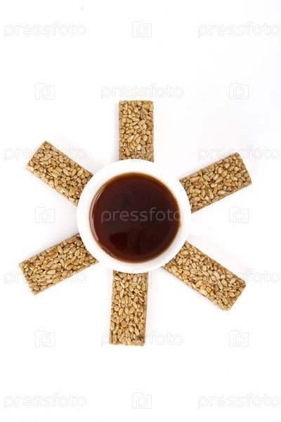 Чашка кофе и козинаки в виде солнца. Вид сверху