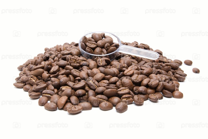 Кофейные зерна и мерная ложка на белом фоне