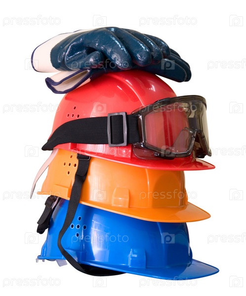 Много цветных строительных касок с перчатками и защитными очками, изолированные на белом фоне