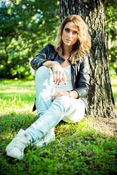 Девушка позирует в кожаной куртке
