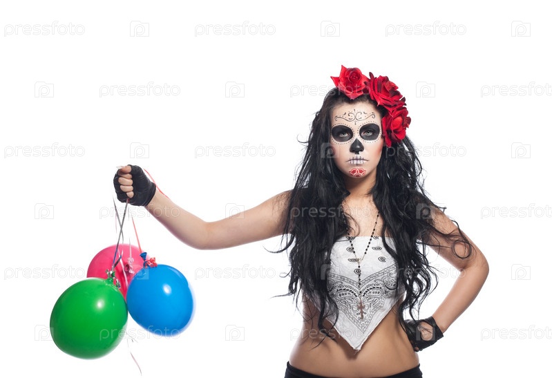 Портрет молодой женщины в образе мертвеца с воздушными шарами