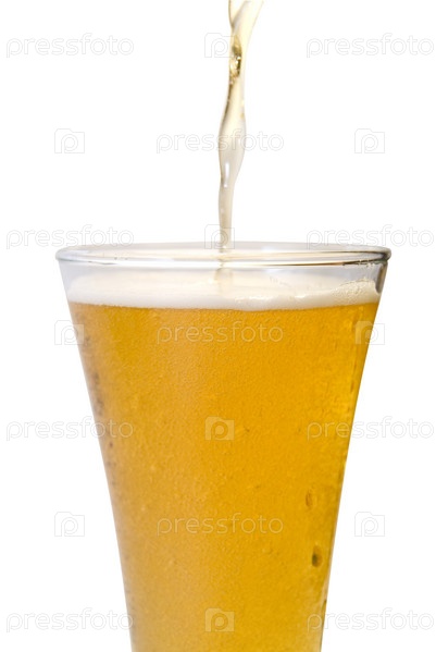 Пиво наливается в стакан, белый фон