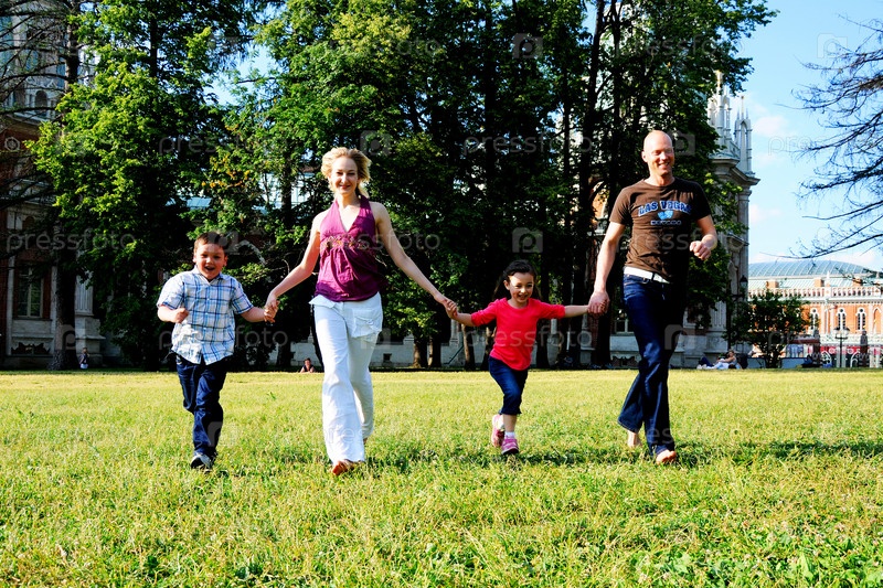 Счастливая семья бежит по зеленой лужайке
