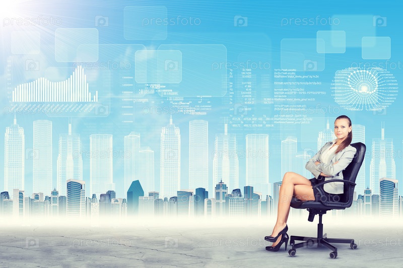 Девушка в кресле со скрещенными руками и глядя на камеру на абстрактного виртуального фона с графами