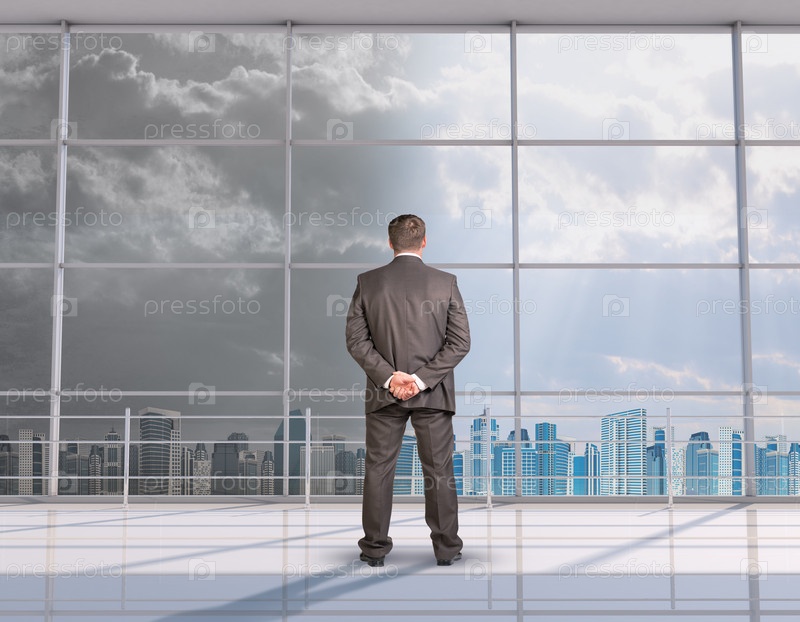 Бизнесмен, глядя на город через окна, вид сзади