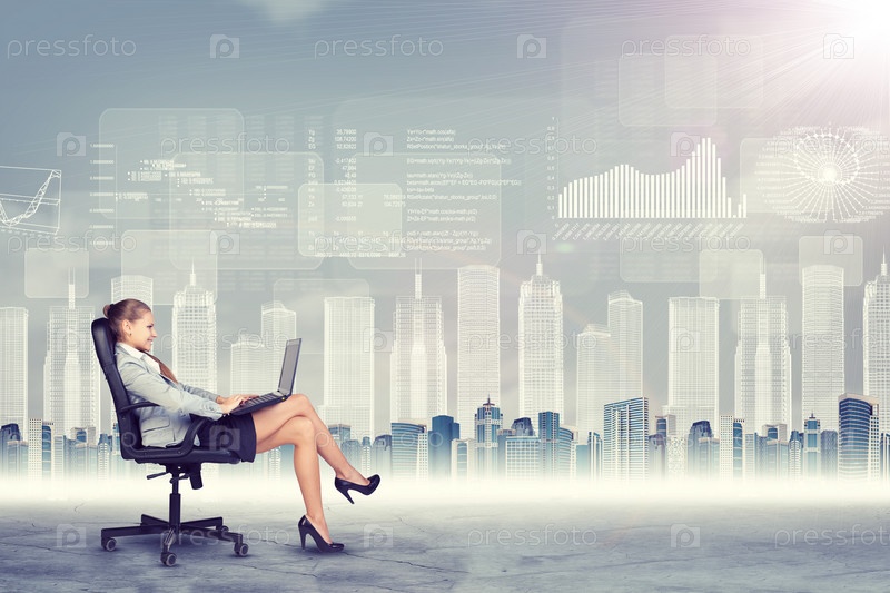 Улыбаясь бизнесвумен, сидя в кресле с ноутбуком на абстрактного виртуального фона