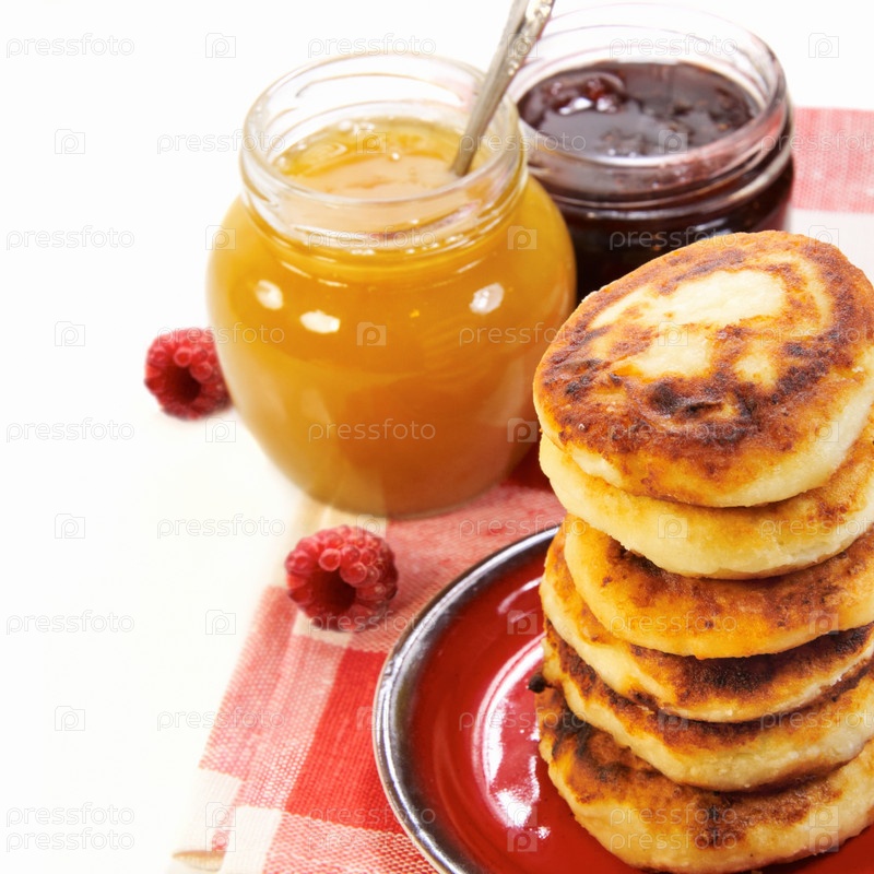 Оладьи, мед, варенье и ягоды на белом фоне. Крупным планом