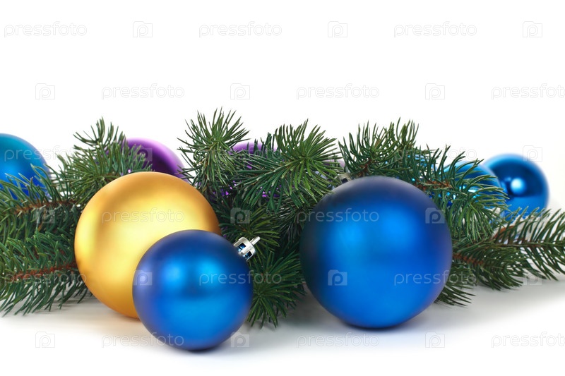 Елочные игрушки и ветка на белом фоне