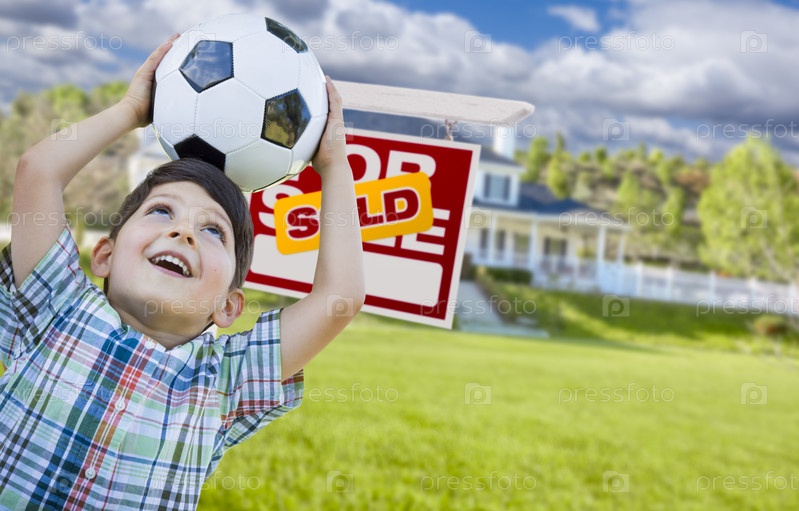 Улыбающийся мальчик держит футбольный мяч перед домом