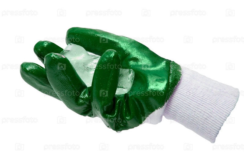 Кубики льда в зеленой перчатке, белый фон