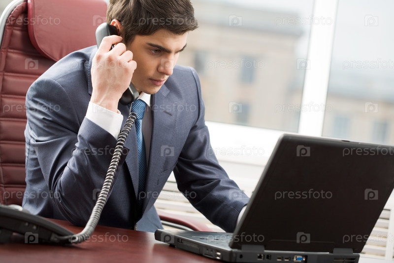 Фото умного бизнесмена, звонящего кому-то перед ноутбуком и смотрящего на монитор в офисе