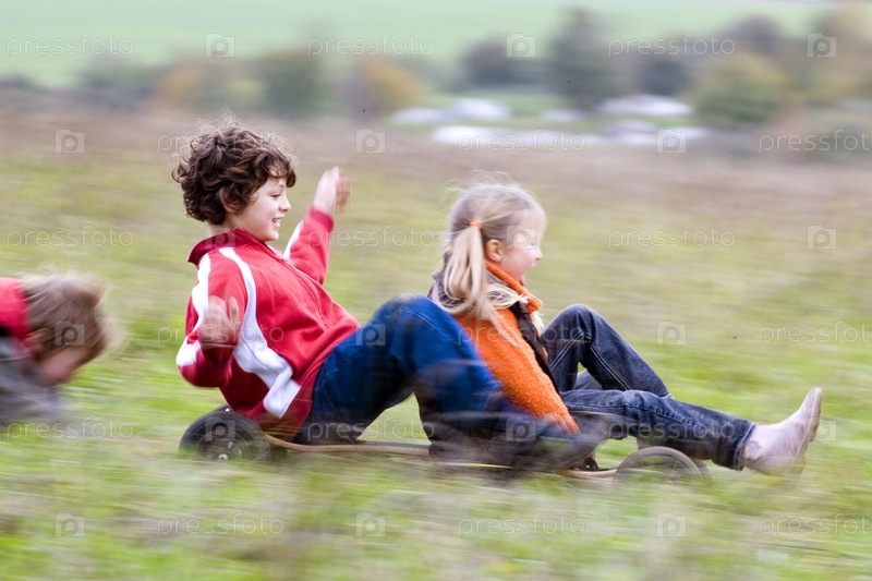 Мальчик и девочка катаются с горки