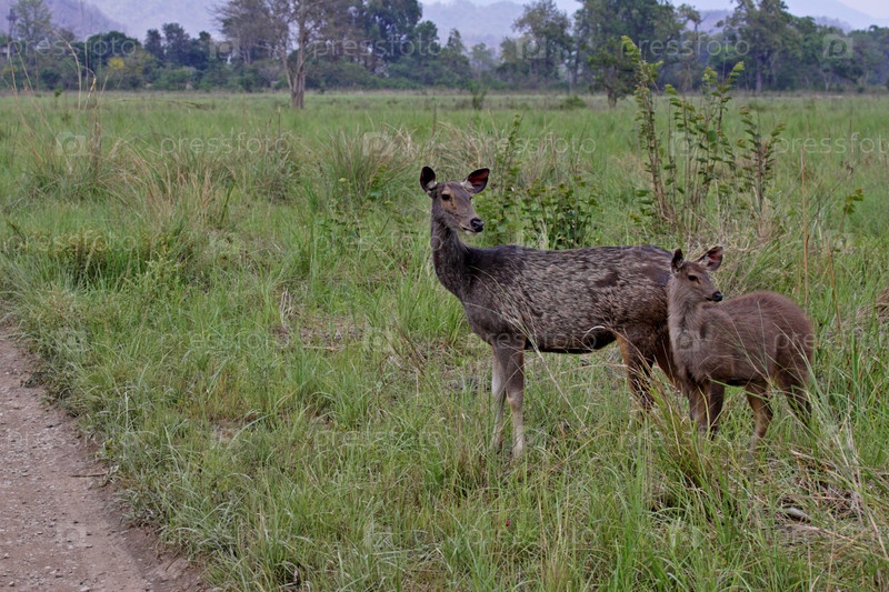Самка оленя самбара с олененком