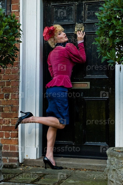 Женщина в юбке и куртке стучится в дверь