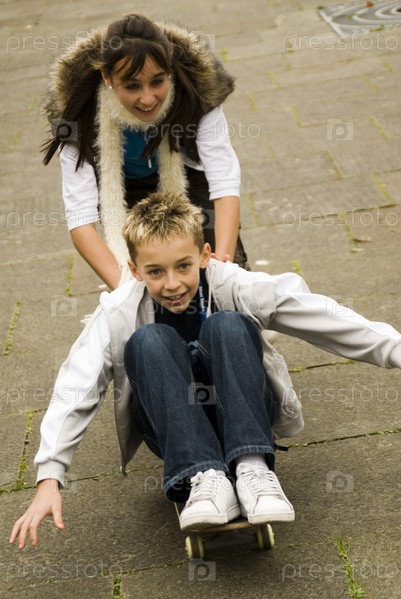 Девочка-подросток, толкая мальчик сидел на скейтборде