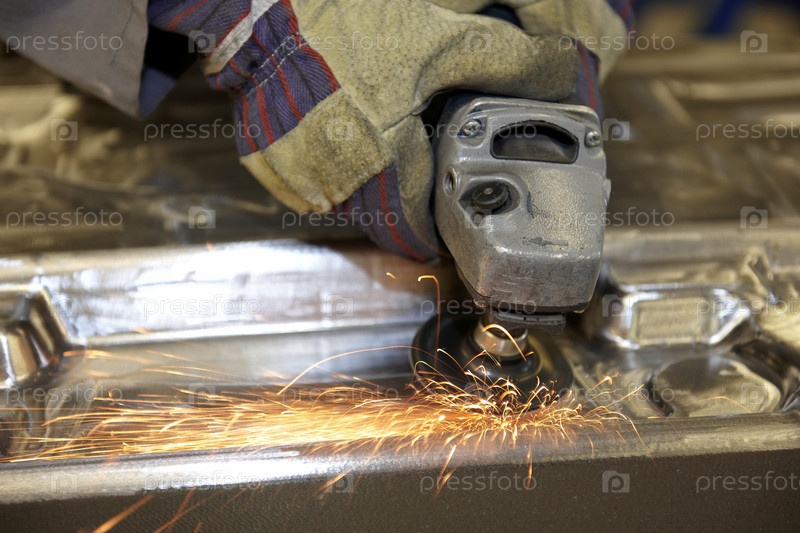 Человек, используя углошлифовальная на металлической поверхности с Спаркс