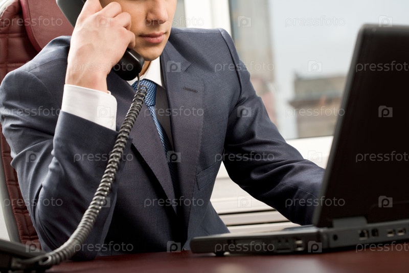 Близкий план умного бизнесмена, звонящего кому-то перед ноутбуком в офисе