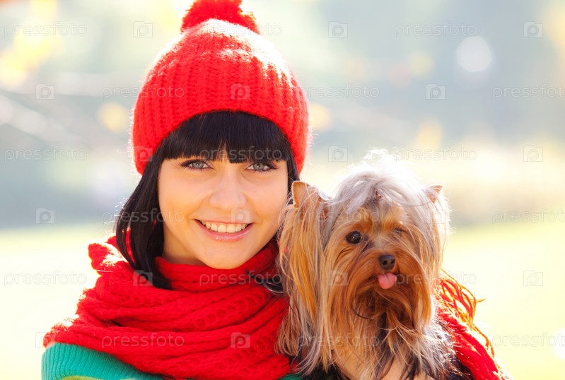Девушка в красной шапке и шарфе держит на руках маленькую собаку
