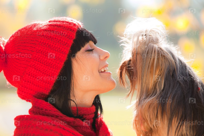 Девушка в красной шапке и шарфе держит на руках маленькую собаку