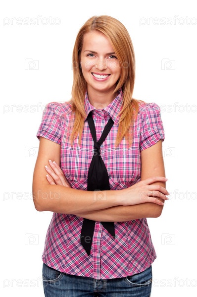 Девушка в клетчатой рубашке и галстуке на белом фоне