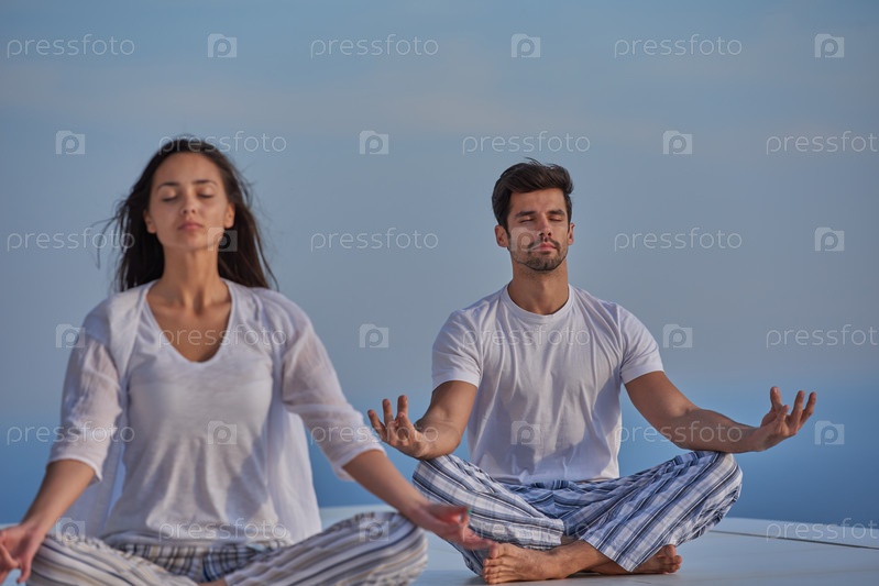 Молодая пара занимается йогой