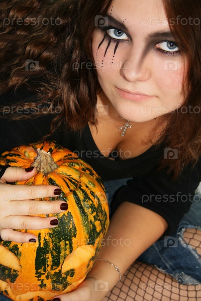 Девушка с тыквой в образе ведьмы