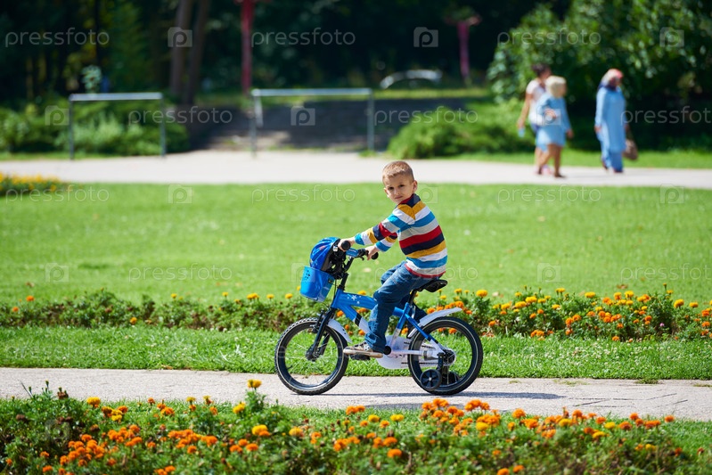 Счастливый мальчик катается на велосипеде