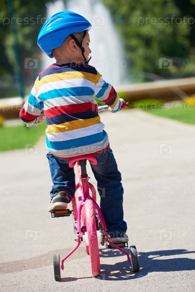 Счастливый мальчик катается на велосипеде